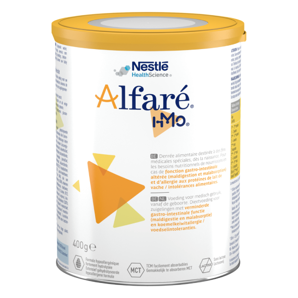 Alfaré® is een hypoallergene formule (extensief gehydrolyseerd wei-eiwitten). Met MCT en nucleotiden. Lactosevrij. Bevat Human Milk Oligosachariden (HMO) 2’FL en LNnT.